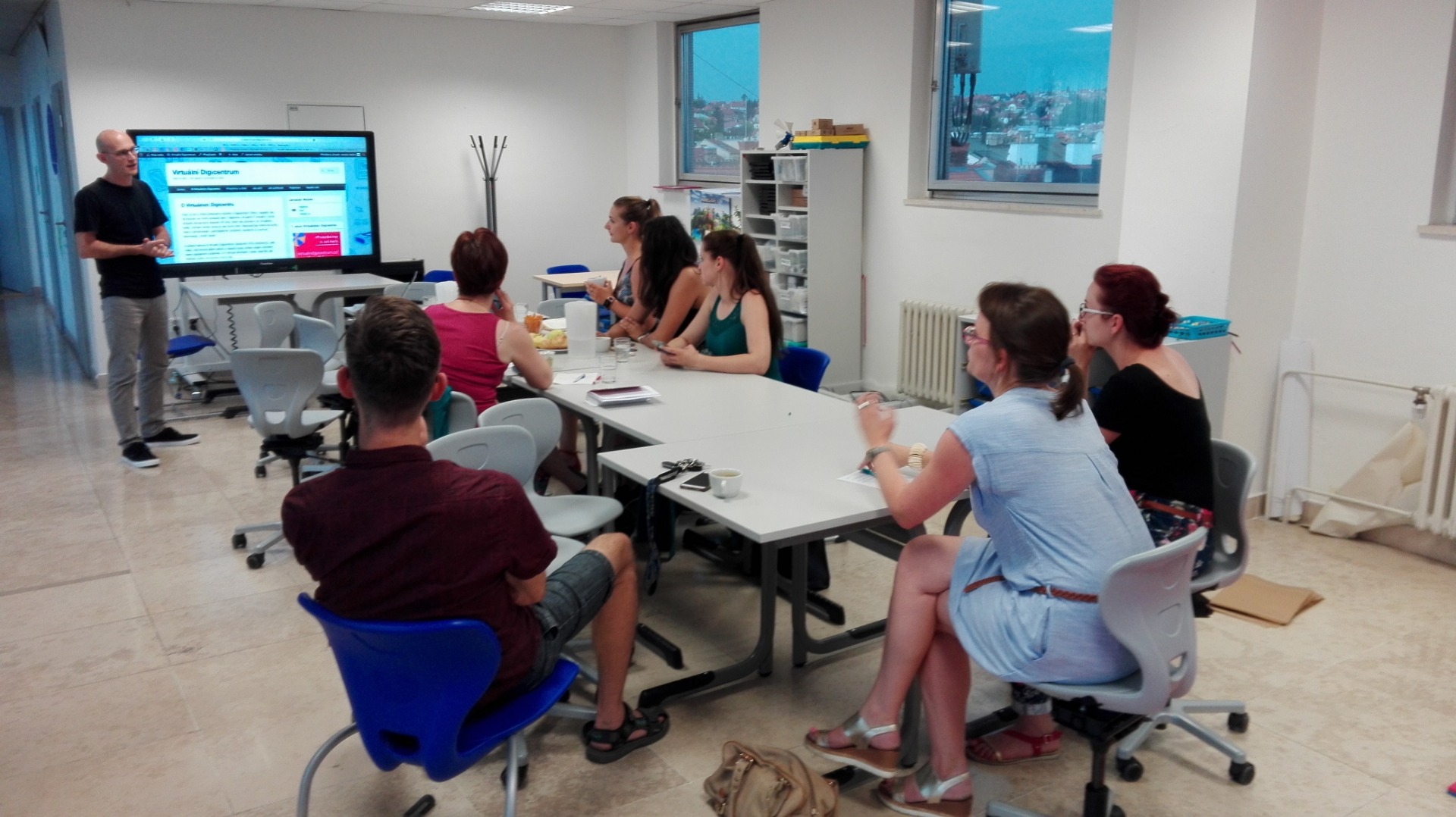 Na posledním setkání v tomto školním roce představil Jaroslav Mašek prázdninovou akci Virtuální Digicentrum iPrázdniny s učiteli. Akce bude probíhat následujících 10 týdnů, během kterých si učitelé vyzkouší 10 různých jednoduchých aktivit, které budou následně moci použít v následujícím školním roce. Aktivita pro tento týden nese téma: Můj školní...